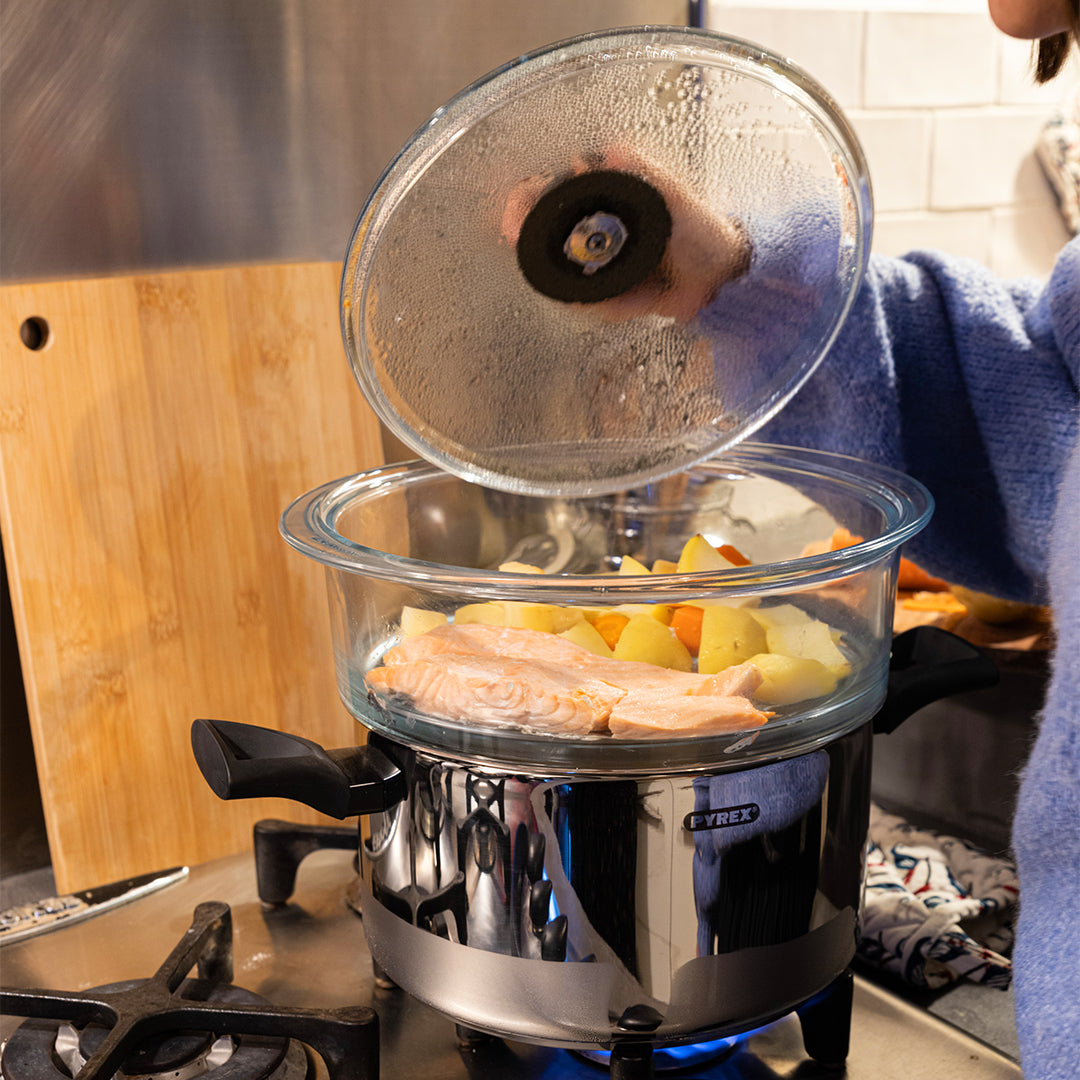 Lachssteaks in den Dampfkorb geben. 10 Minuten garen lassen.
