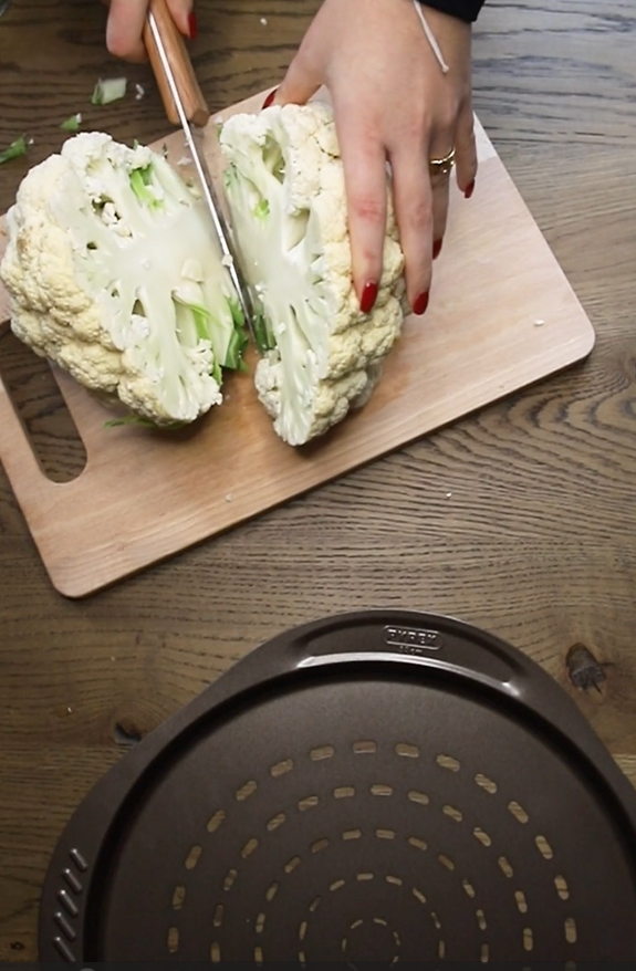 Auf einem Pizzablech zerdrücken Sie das Blumenkohlmehl/-pulver.