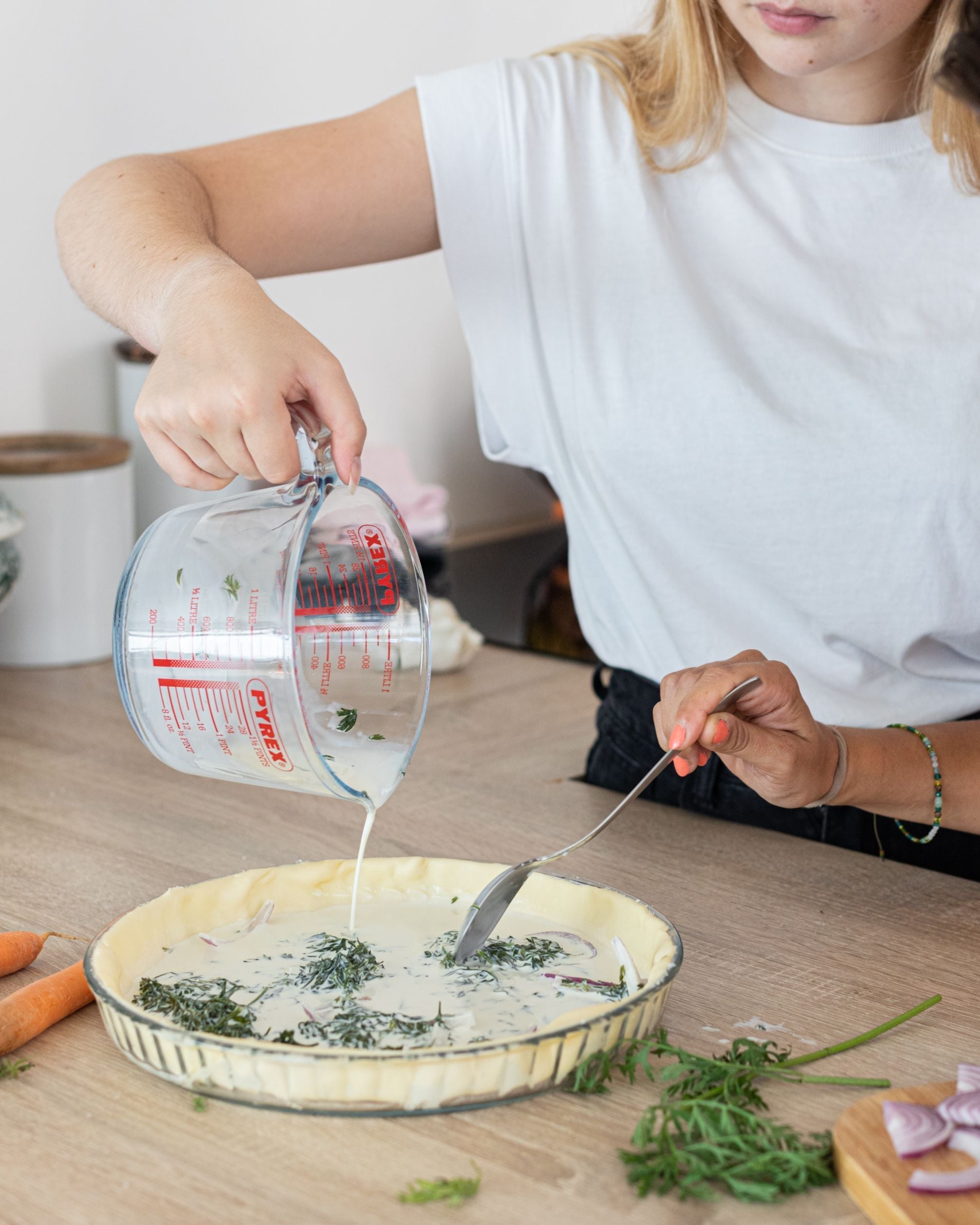 Dans un bol, cassez les œufs, ajoutez la crème, salez et poivrez. Ajouter les fanes de carottes cuites et l'oignon rouge émincé.