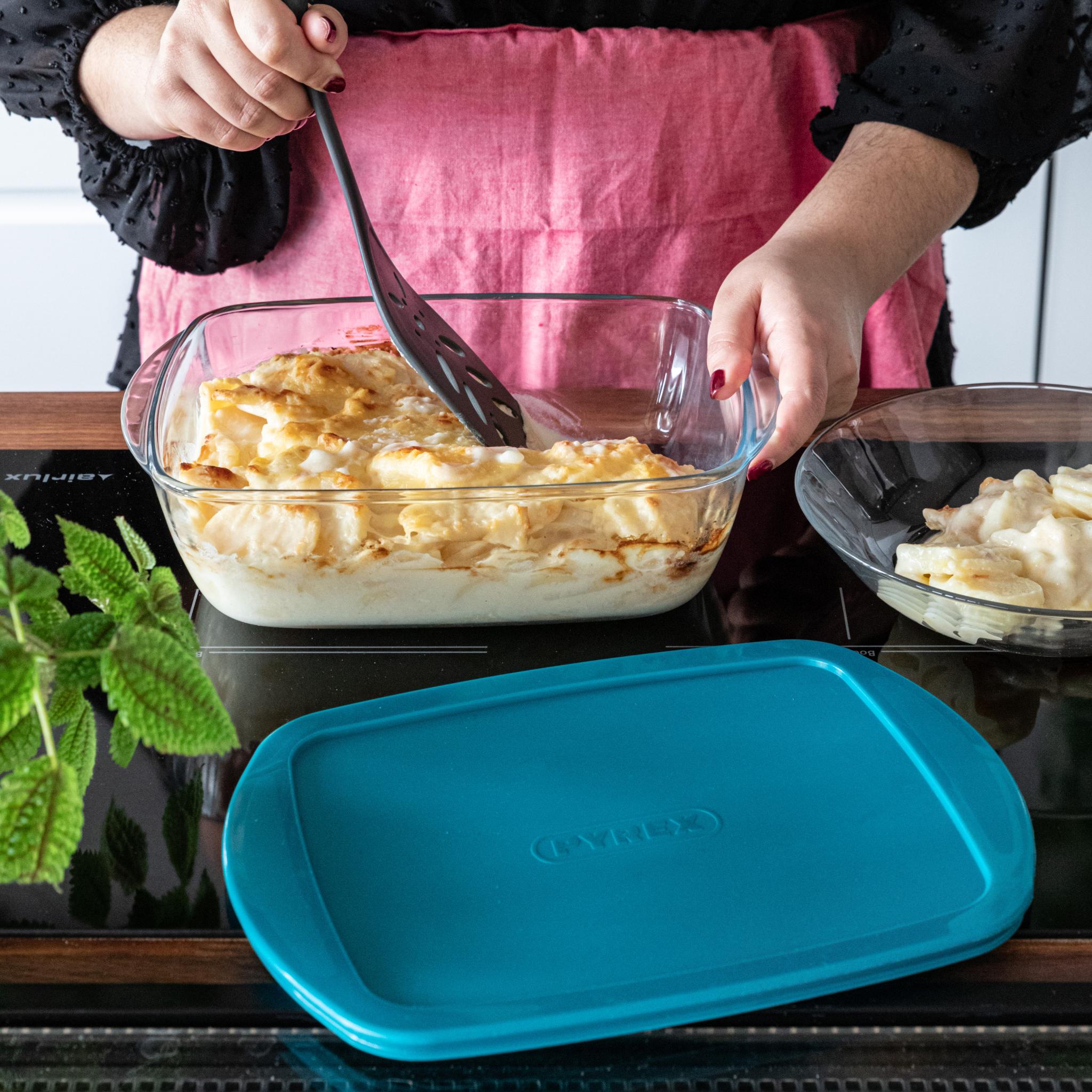 Il vetro borosilicato Pyrex® è rinomato per la sua robustezza e resistenza agli shock termici fino a 240°C. Questo materiale consente un passaggio sicuro dal freezer al forno o viceversa, garantendo la massima versatilità. La facilità di pulizia, la durata e l'affidabilità ne fanno una scelta di qualità per l'uso quotidiano. Si prega di notare che il coperchio non è adatto al forno o al microonde.