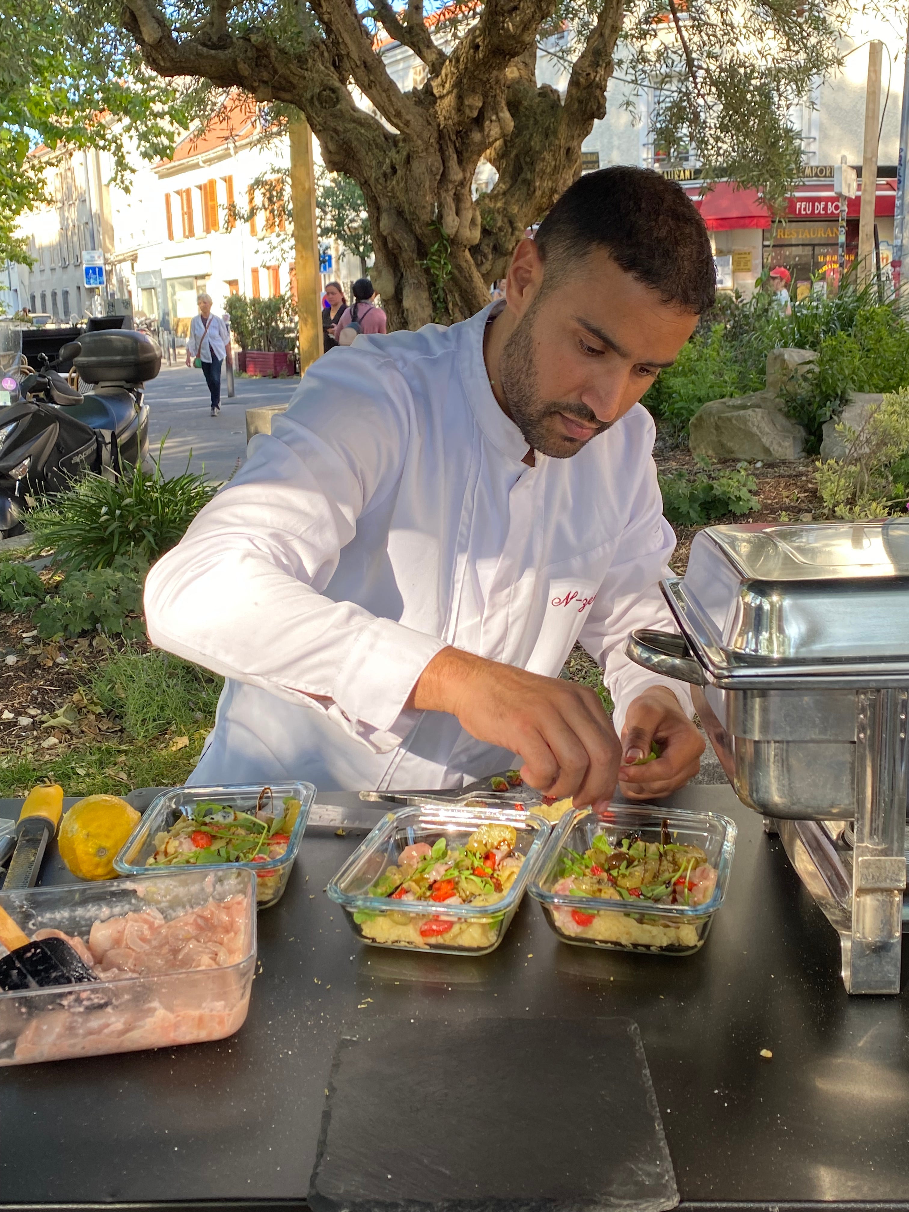 De stappen zijn eenvoudig: we beginnen het brood lichtjes te bevochtigen voordat we het in de oven plaatsen op een Pyrex®-glasplaat om het een tweede versheid te geven en we maken gebruik van de hete oven om het overgebleven gevogelte opnieuw op te warmen. Tijdens het koken bereiden we een marinade met sojasaus, honing en