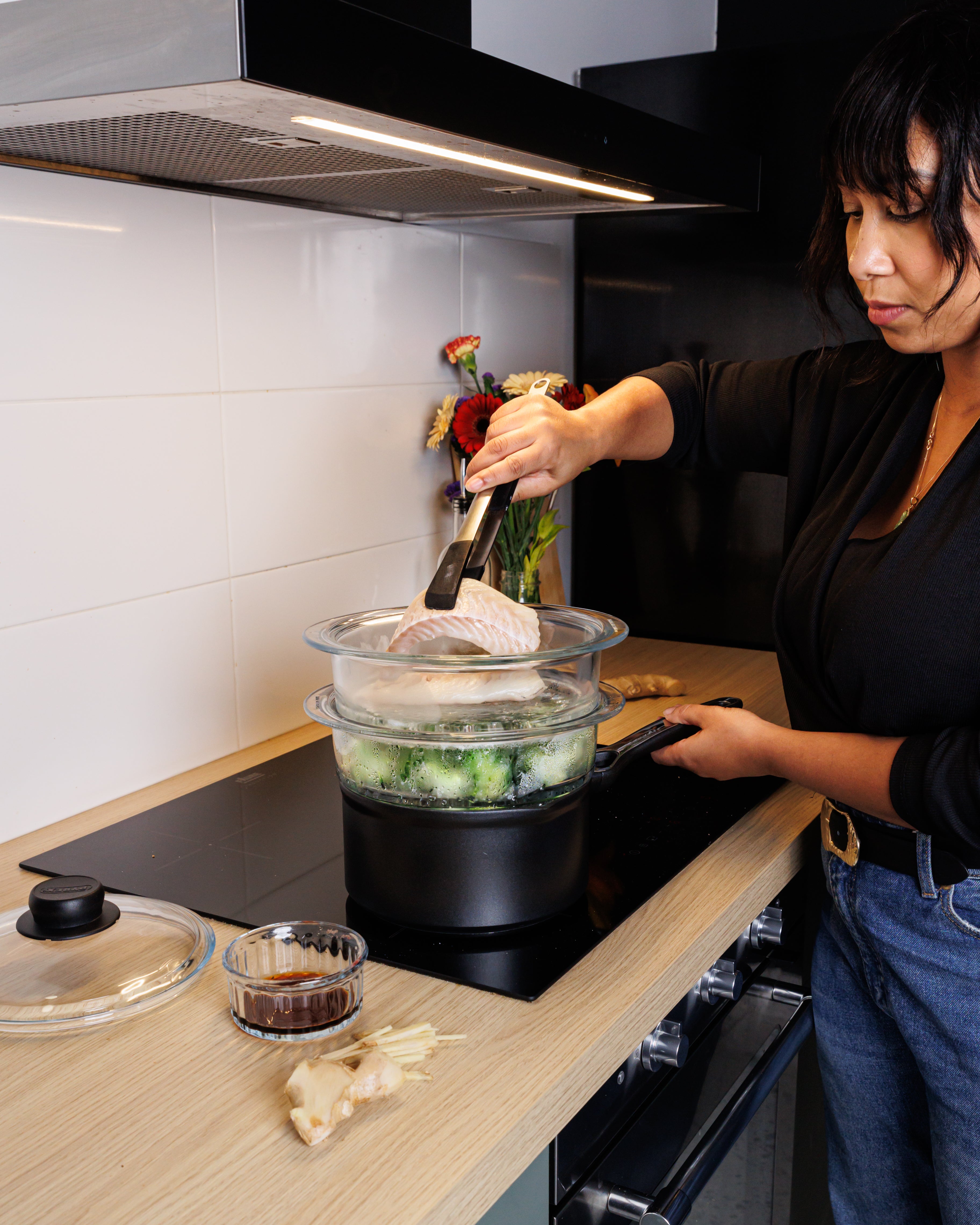 Zodra het water kookt, plaats je de twee stoommandjes op de pan.