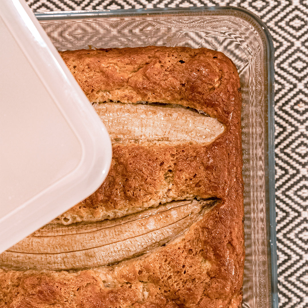 Snijd de overgebleven banaan in 2 en schik op de taart. Bestrooi met bruine suiker.