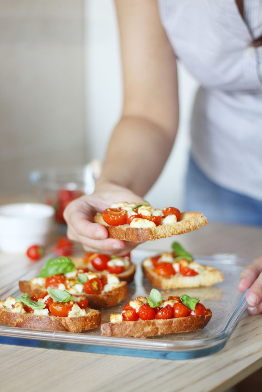 Haal de bruschetta's uit de oven, besmeer ze met een beetje burrata en bedek ze met het tomaten- en rucolamengsel.